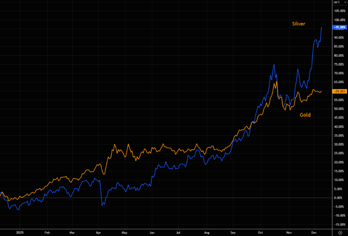 据华尔街见闻此前文章,今年以来,白银涨幅已接近110%,远超黄金60%涨幅,导致金银比价降至70倍以下,为2021年7月以来首次。美联储降息预期、供应短缺,以及因被列入美国“关键矿产”清单引发的囤积效应等因素,共同推升白银价格走高。