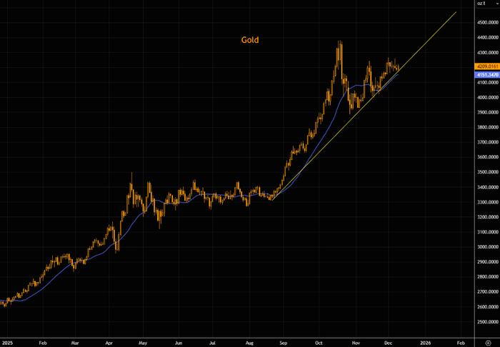 据The Market Ear分析,尽管白银作为高贝塔资产出现了挤仓式上涨,但黄金走势严重滞后。目前金价正企稳于21日均线上方的趋势线上,形成所谓“牛旗”形态,这通常是向高点发起冲击前的前兆。