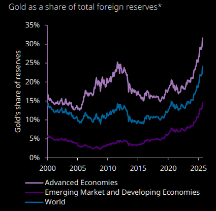 在新兴市场储备方面,需求端同样具备结构性支撑。目前新兴市场国家的黄金储备量相较于发达国家仍有较大差距,具备“追赶”发达国家水平的空间。分析指出,如果有地缘政治紧张局势升级,新兴市场的黄金购买速度可能会加快,从而为金价提供强有力的结构性支撑。